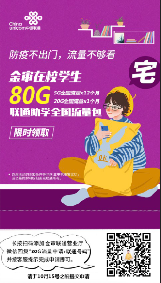 掃描右側二維碼添加金審聯通營業廳微信,微信回複 “80G流量申請+聯通号碼”,按提示完成申請即可領取。(請在1015日之前提交申請)