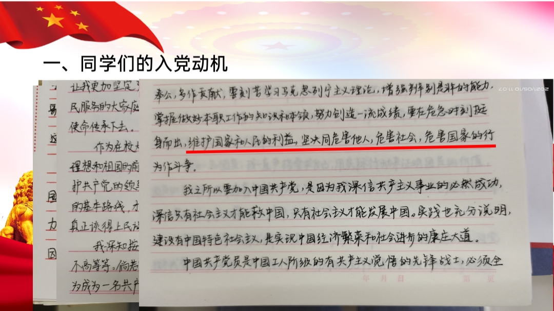 講座開始,孫老師就跟同學們強調到:“黨的曆史是最生動、最有說服力的教科書,同學們應積極向黨組織靠攏。”孫老師從“政治正确”和“現實功利”兩個角度,再次強調了同學們要端正入黨動機,要把“全心全意為人民服務”作為自己的初心和使命。