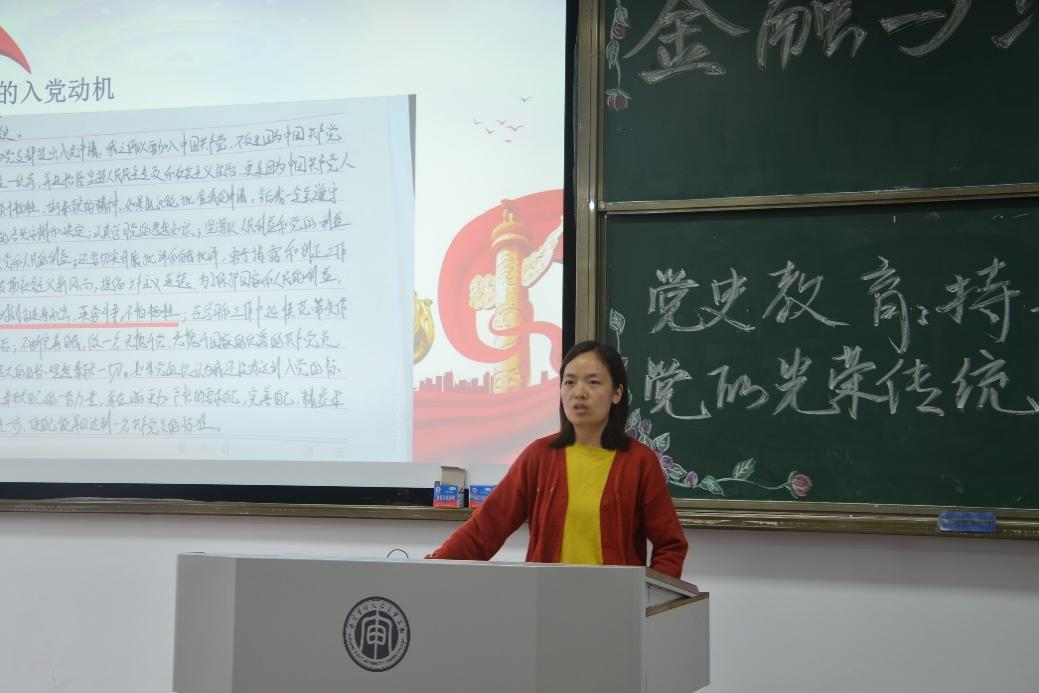 其次,孫老師還向同學們講述了三個曆史偉人的故事。一是朱德苦苦追尋跟随黨的步伐,二是焦裕祿的三份入黨申請書,三是年高83歲的牛犇莊嚴宣誓加入中國共産黨。一個個感人至深的故事、一段段令人動容的文字讓大家深刻感悟到革命先輩的精神力量。對于宣講團成員和黨員學生來講,這是一次感觸深刻的黨性教育,使得大家對黨史的宣講工作具有更加堅定的信念和動力。