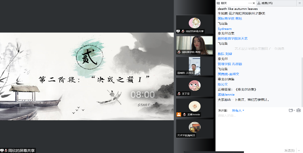 競賽場上,同學們沉着冷靜、獨自思索、認真作答。懷着飽滿的熱情,用實力驗證着自己課外閱讀的水平,為自己的隊伍争得比分。他們熟知中外名著,能僅憑一句話判斷出其出處,速度之迅速令人歎為觀止。