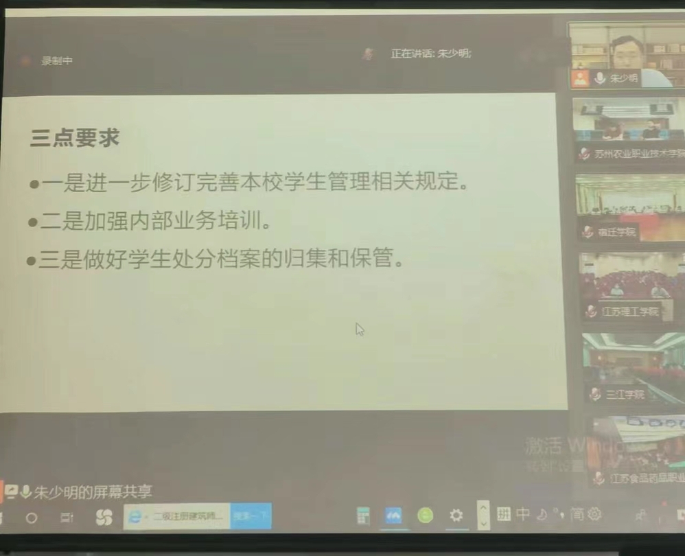 視頻會上,江蘇博事達律師事務所的高級律師周連勇聯系了高校學生處分管理中的實際案例,為大家詳細講解了學生違紀處分管理的規範流程。省教育廳高校學生處副處長朱少明對規範高校學生管理工作談了兩點體會,提出三個要求。兩點體會是要規範做好學生處分工作;要用心用情做好學生日常管理。三個要求是進一步修訂完善本校學生管理相關規定;加強内部業務培訓;做好學生處分檔案的歸集和保管。