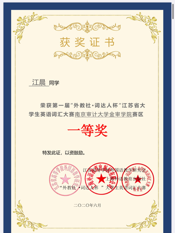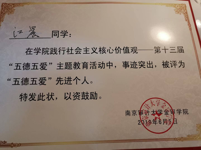 她學習優異,貢獻卓越,獲得多次校一等獎學金、校英語競賽一等獎、英語詞彙大賽三等獎、優秀學生幹部、優秀團員。