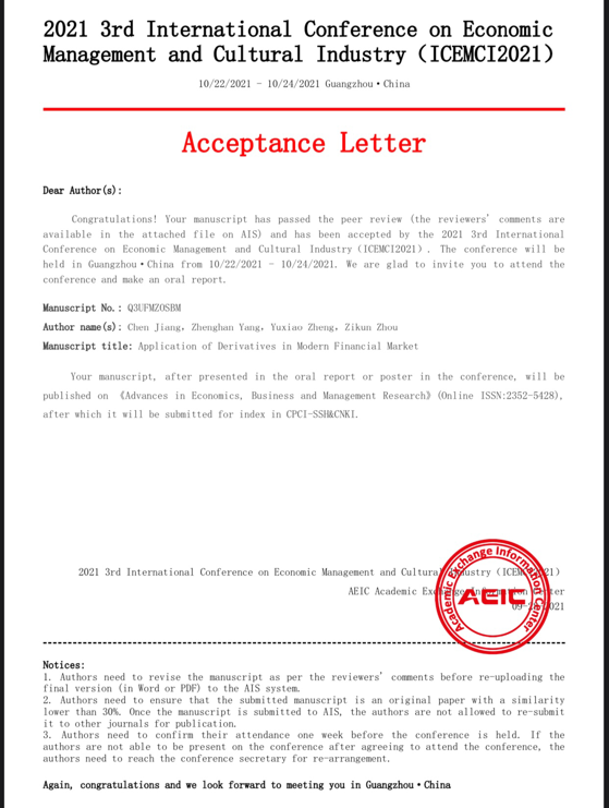在整個項目中,我掌握了如何評估和使用不同類型的複雜金融工具來平衡投資風險和回報的多樣性和密切合作,我們的團隊取得了一個意想不到的結果,我被邀請參加2021年經濟管理與文化産業國際會議,并做報告,介紹我們的研究大綱。這對我來說是一次重要的經曆,因為我在參與過程中學會了成為一個優秀的團隊成員,也培養了良好的量化技能。