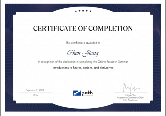 不滿足于僅僅從教材中汲取營養,我積極參與科研項目和實習。2021年夏季,跟随劍橋大學的教授參與了《金融市場研究》項目:期權、期貨及其他衍生品分析在大學期間,我學習了金融市場投資所需的核心知識和技能,包括無套利原理、遠期、期貨、期權、二叉樹期權定價模型、Black-Scholes期權定價模型、實物期權等。