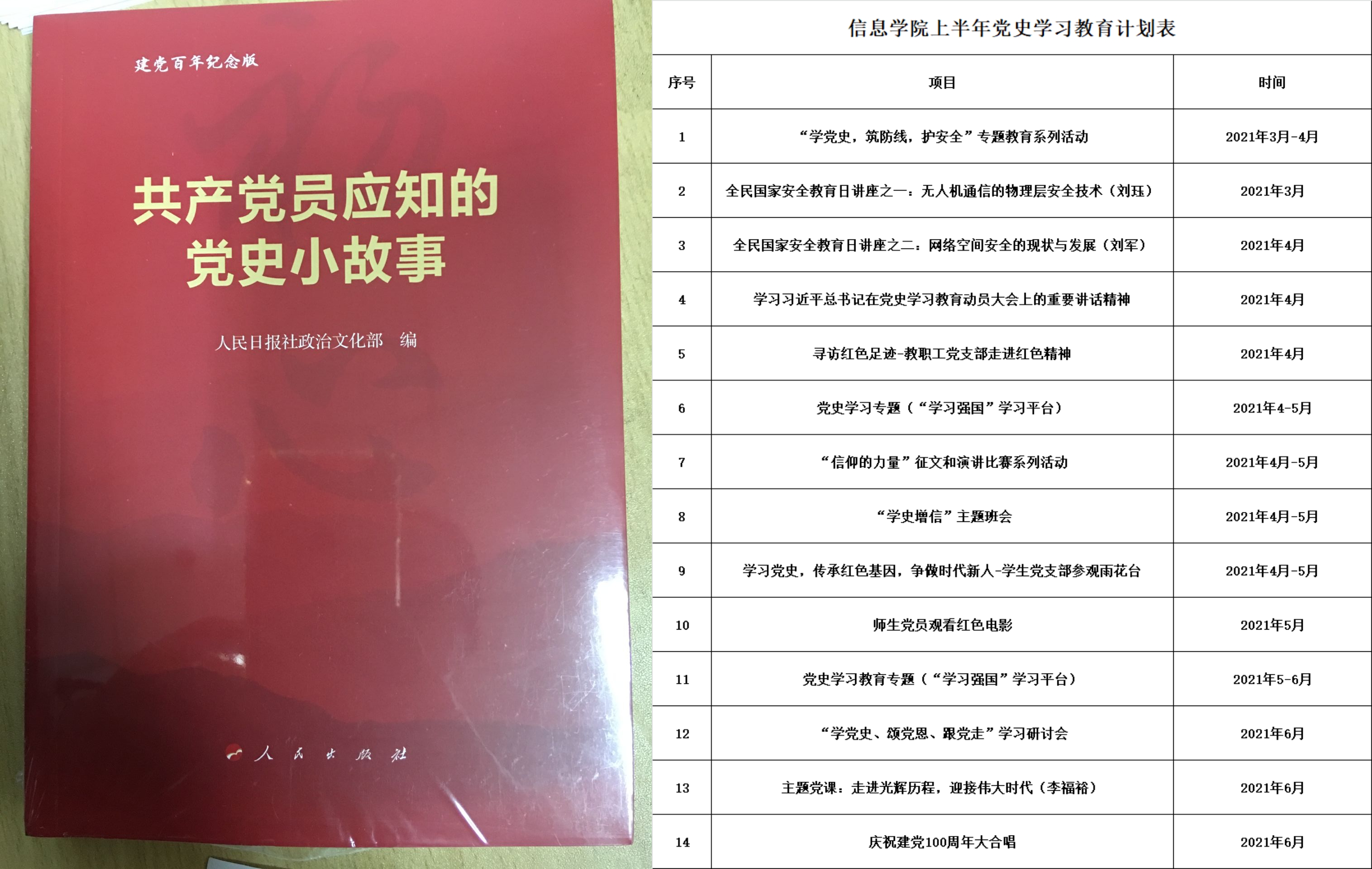 同時,學院為各班級統一訂購了書籍《共産黨員應知的黨史小故事》,積極在學院内部開展黨史學習教育,使全體師生做到學史明理、學史增信、學史崇德、學史力行。